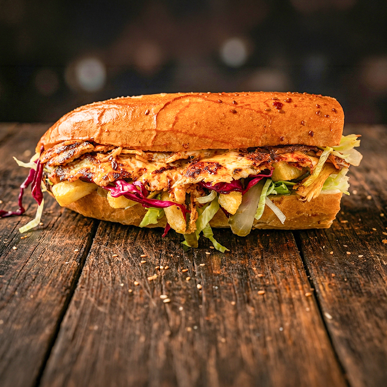 Tavuk Döner 90/ 120/ 150 gr. Özel ekmeği içine; Patates kızartması, Turşu, mayonez, Özel sos.
