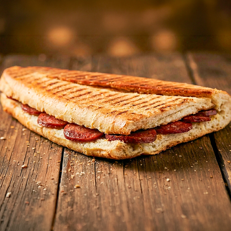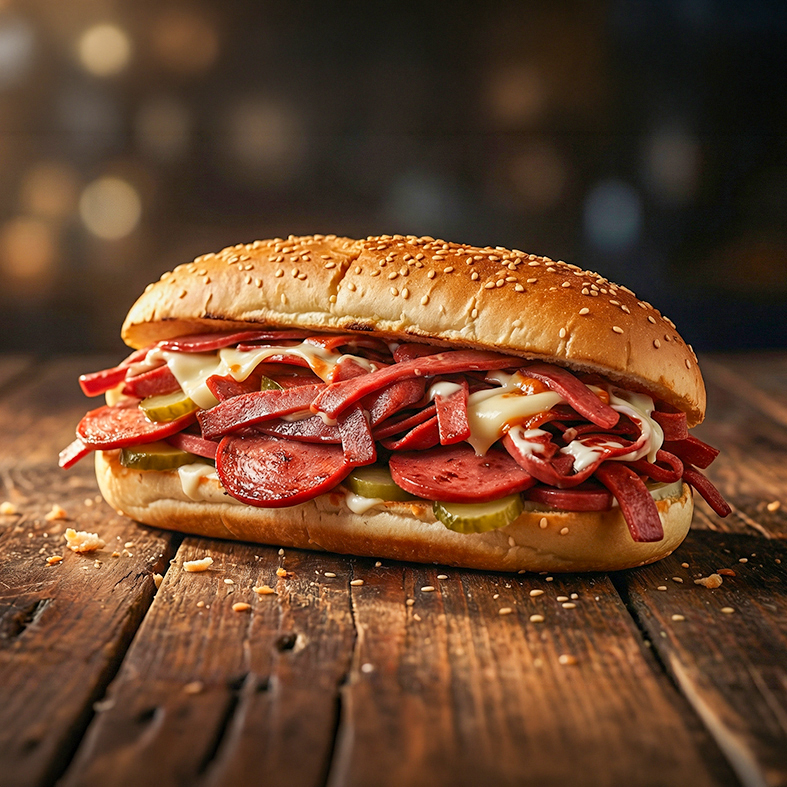 sandviç ekmeğine sucuk, salam, sosis, kaşar peyniri ve domates, mayonez, Özel sos.
