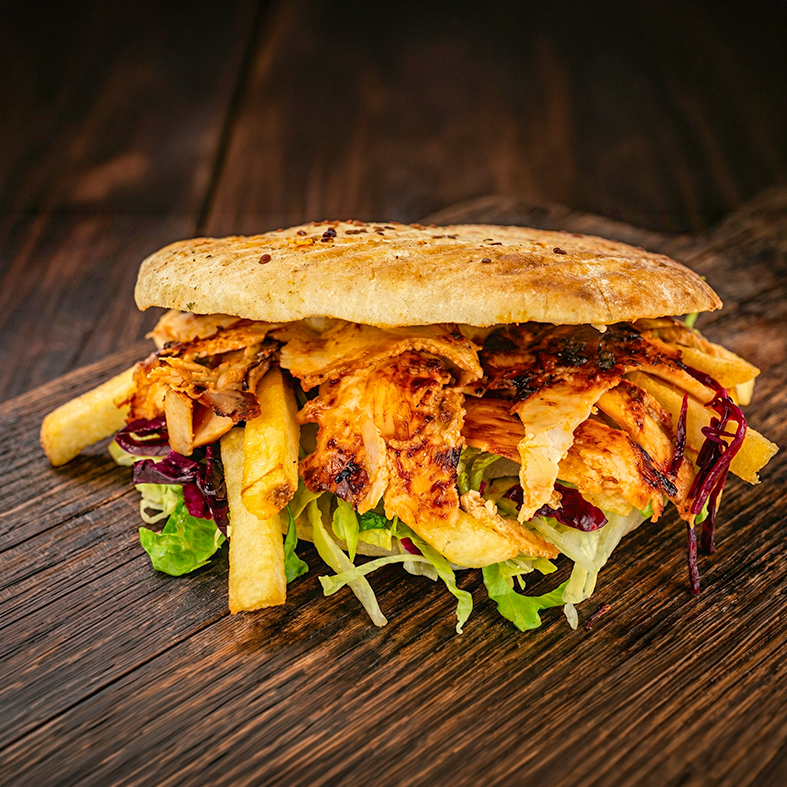 Tavuk Döner 90/ 120/ 150 gr. Özel Hatay lavaş ekmeği içine; Patates kızartması, Turşu, mayonez, Özel sos.